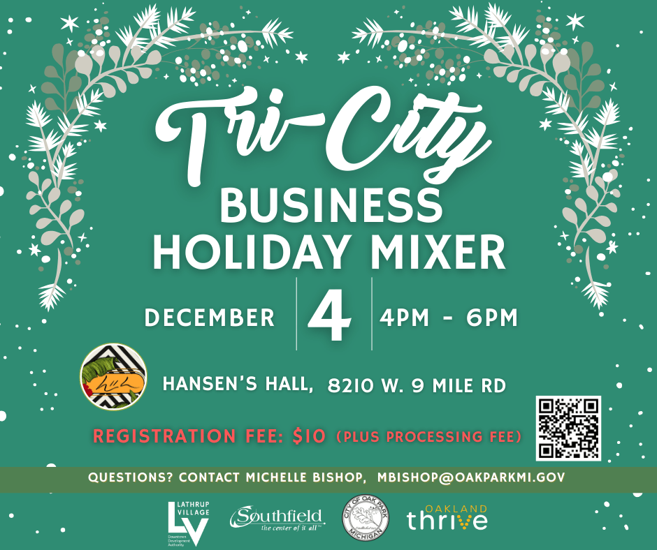 Join us and network with fellow business owners from Oak Park, Southfield, and Lathrup Village. Enjoy a light dinner, festive cheer, and great company. Attendees will automatically be entered into our raffle drawing for prize baskets from local businesses. Use the QR code to register or click on the following link: https://bit.ly/holidaymixertickets