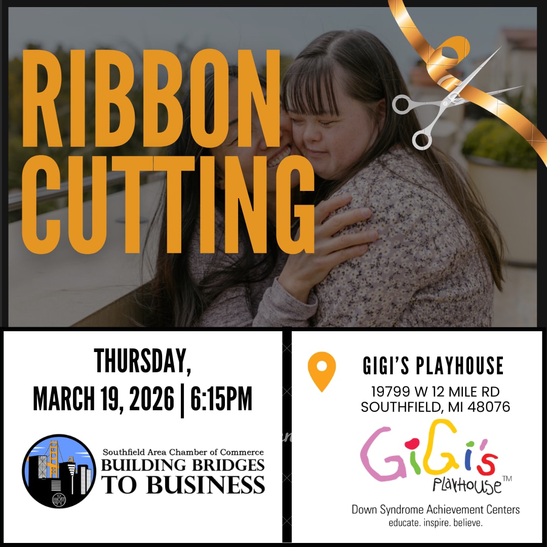 You’re invited to celebrate an inspiring mission in our community! Join the Southfield Area Chamber of Commerce for a ribbon cutting at GiGi’s Playhouse Detroit, a Down Syndrome Achievement Center dedicated to educating, inspiring, and empowering individuals with Down syndrome and their families. Come welcome this impactful organization to the Southfield community and learn more about the incredible work they are doing to create opportunity, inclusion, and support.