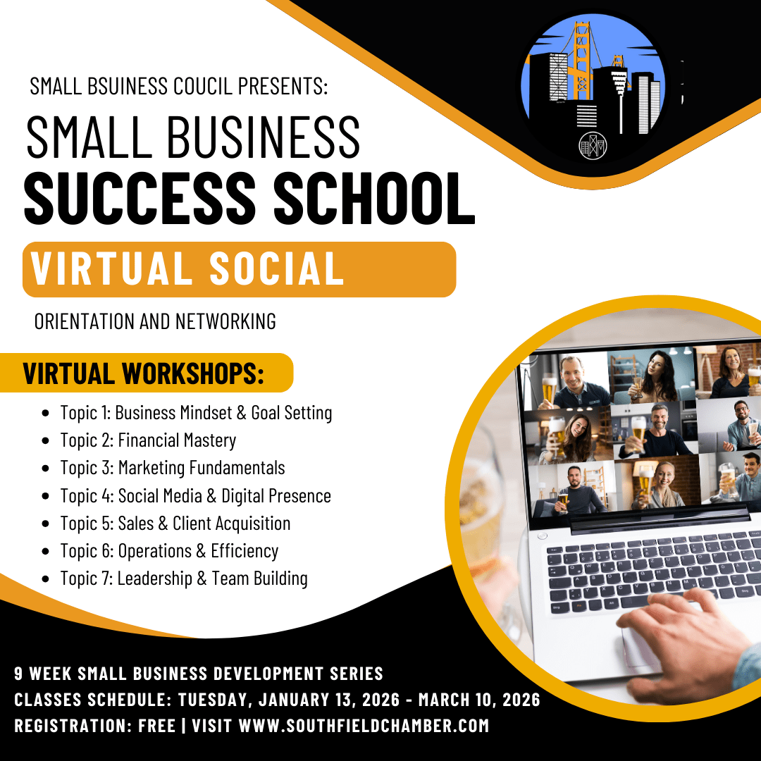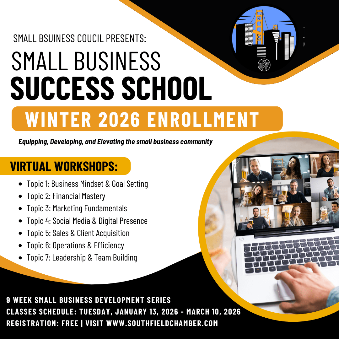 The Small Business Success School is a free virtual learning series hosted by the Southfield Chamber of Commerce, designed to equip entrepreneurs and small business owners with practical, real-world strategies they can apply immediately. Classes will be held every Tuesday from January 13, 2026 through March 10, 2026 12:00pm - 1:00pm, featuring experienced professionals and thought experts covering key areas of business growth, leadership, operations, and success. Whether you are starting, scaling, or strengthening your business, these sessions provide valuable insights, connection, and support at no cost. Registration is free—register today to attend. If you are interested in serving as a thought expert and teaching in your field, please email membership@southfieldchamber.com to request an application.