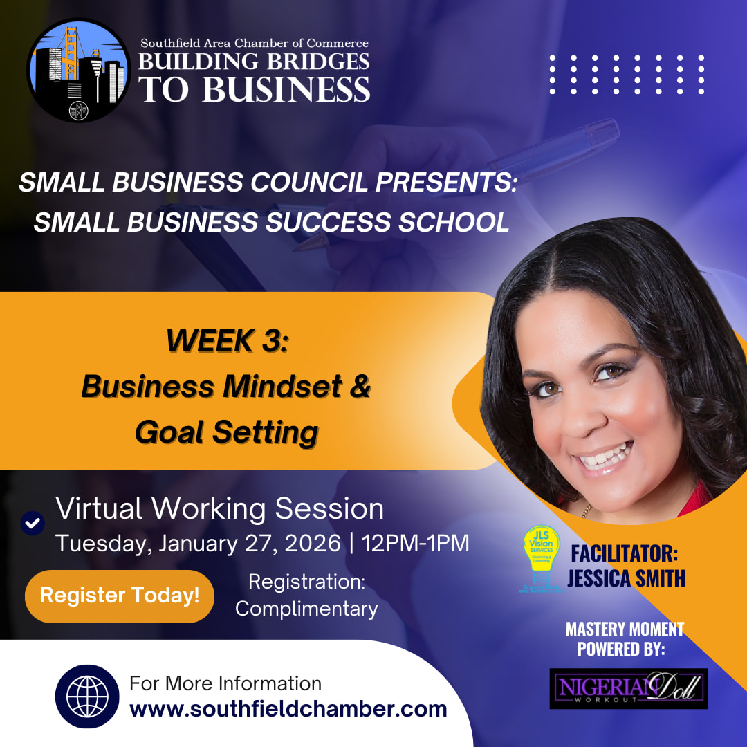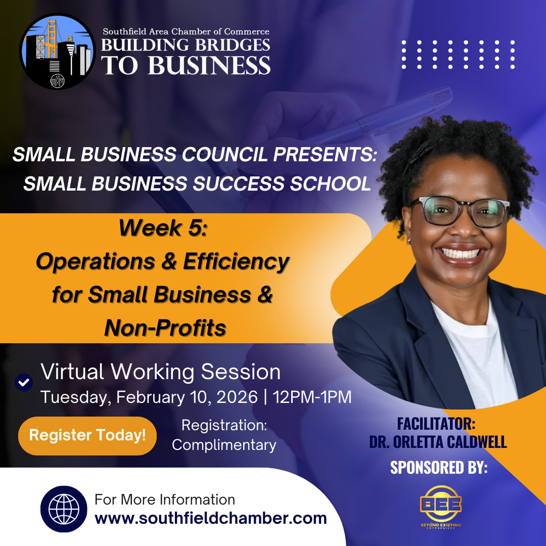 The Small Business Success School is a free virtual learning series hosted by the Southfield Chamber of Commerce, designed to equip entrepreneurs and small business owners with practical, real-world strategies they can apply immediately. Classes will be held every Tuesday from January 13, 2026 through March 10, 2026 12:00pm - 1:00pm, featuring experienced professionals and thought experts covering key areas of business growth, leadership, operations, and success. Whether you are starting, scaling, or strengthening your business, these sessions provide valuable insights, connection, and support at no cost. Registration is free—register today to attend. If you are interested in serving as a thought expert and teaching in your field, please email membership@southfieldchamber.com to request an application.