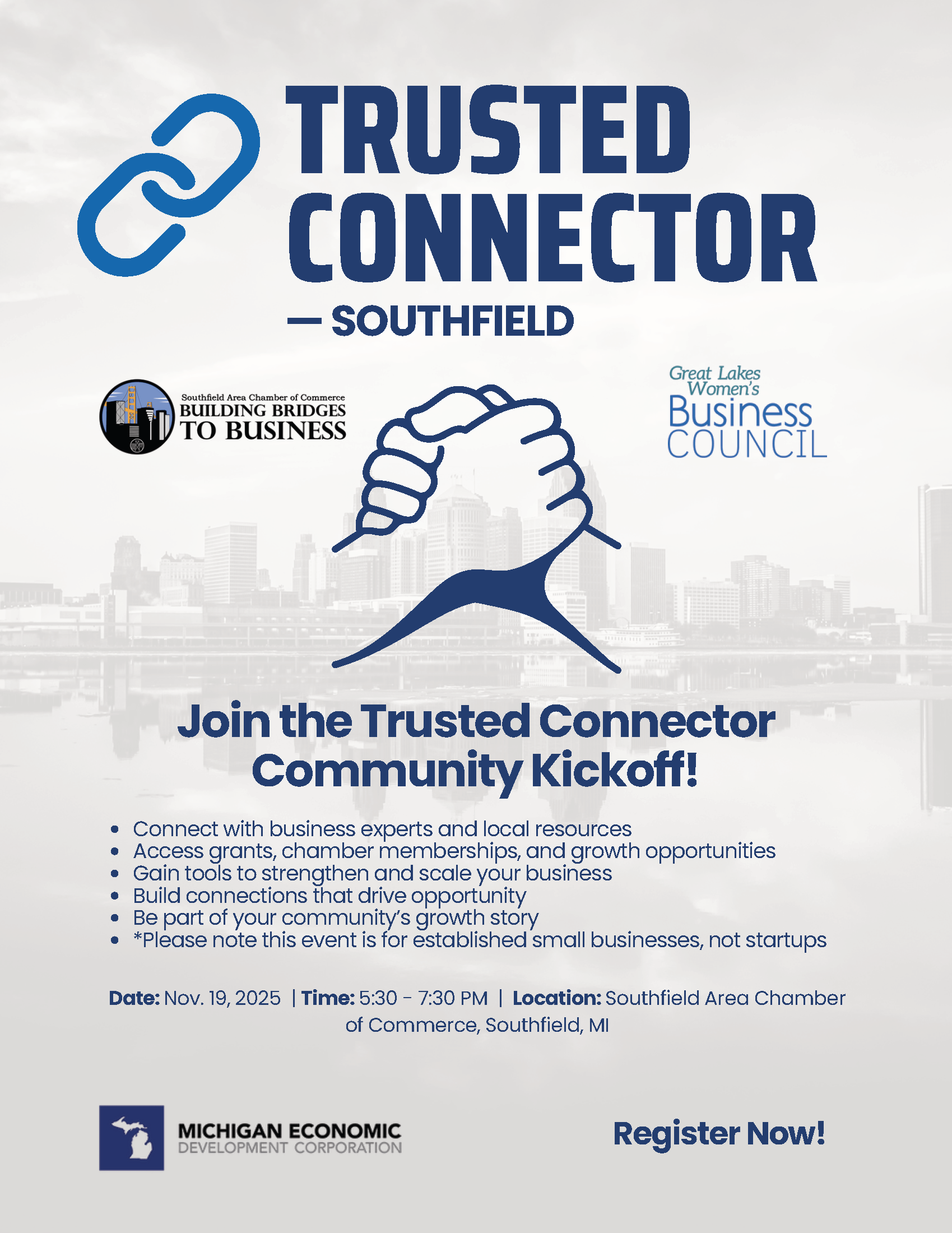 To introduce the Trusted Connector Program to the Southfield business community, celebrate the partnership between the Southfield Chamber of Commerce and the Great Lakes Women’s Business Council, and inspire participation among local business owners.