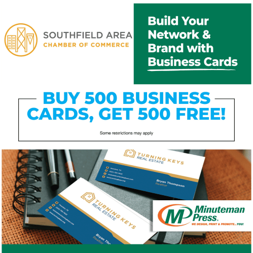 Chamber members: double your cards without doubling your cost! Order 500 business cards through Minuteman Press in Clawson and receive 500 more at no extra charge.